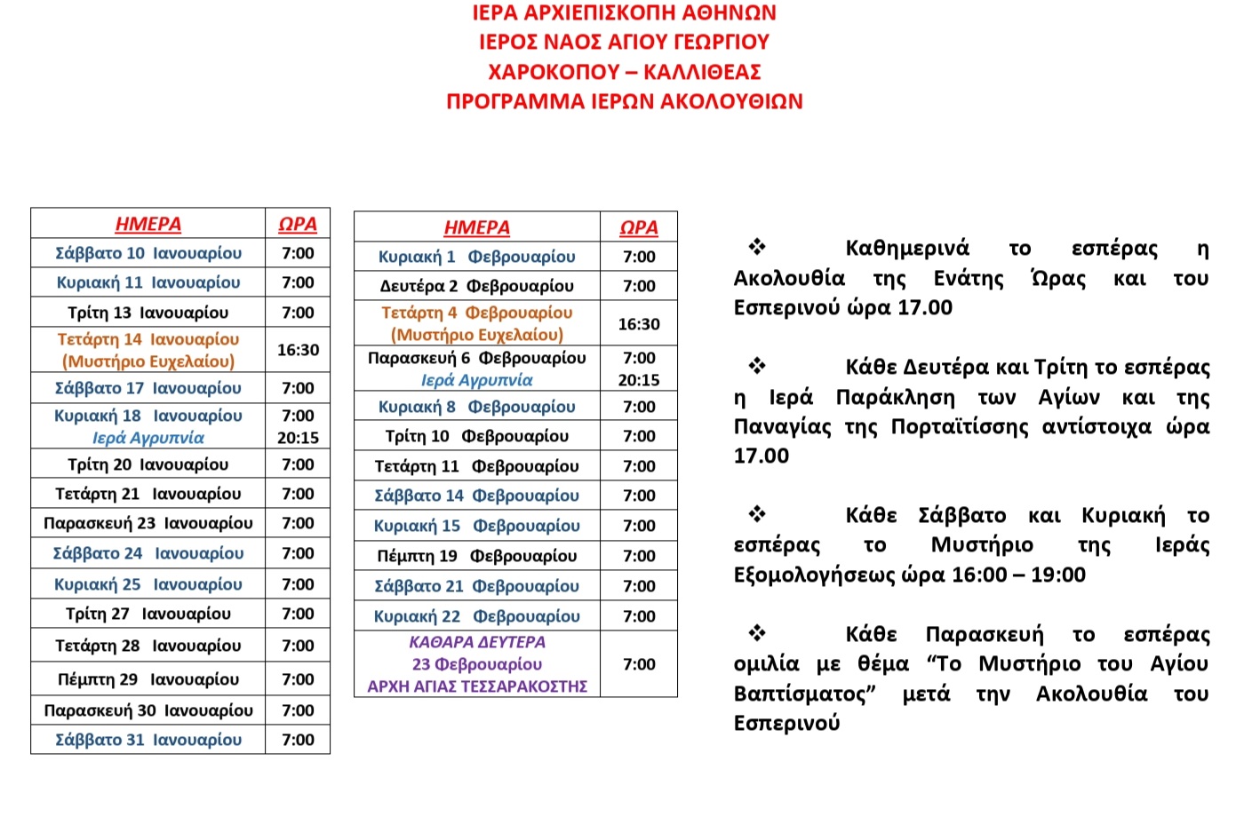 - Κάθε Παρασκευή το εσπέρας ομιλία με θέμα "Το Μυστήριο του Αγίου Βαπτίσματος" μετά την Ακολουθία του Εσπερινού.