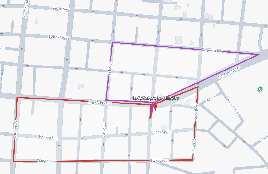 Μωβ διαδρομή: Επιτάφιος - Κόκκινη διαδρομή: Αγίου Γεωργίου